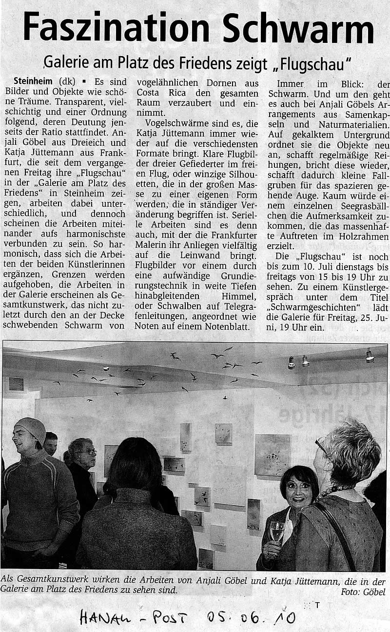 Die Frankfurter Künstlerin Katja Jüttemann und Anjali Göbel aus Dreieich haben sich mit dem Schwarmverhalten von Vögeln und Insekten beschäftigt und zeigen ihre Ergebnisse in einer Gesamtinstallation mit dem Titel: "Flugschau". Auf