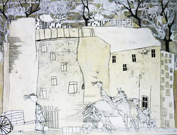 Elke Pollack: Auf wenige Striche reduzierte rundgesichtige Männer, Frauen und anmutige Mädchen radeln, sitzen, liegen oder lümmeln sich durchs Leben; mit Öl, Kreide und Stiften auf Papier und Leinwand festgehalten. Schweigend, mit Katze, im gepunktetem Kleid, auf rotem Stuhl, alle beieinander oder unterwegs sind sie Protokolle der einfühlsamen Aufmerksamkeit von Elke Pollack für das Wesentliche des Augenblicks im ganz normalen Alltag. Die collageartigen Hintergründe der Figuren aus gemalten, gezeichneten, geritzten und geklebten Elementen reflektieren den Zustand ihrer ureigenen Welt; erzählen vom Leben der Menschen und der Suche nach Wahrheit. Elke Pollack lebt in Berlin und arbeitet als freischaffende Malerin, Grafikerin und Illustratorin.